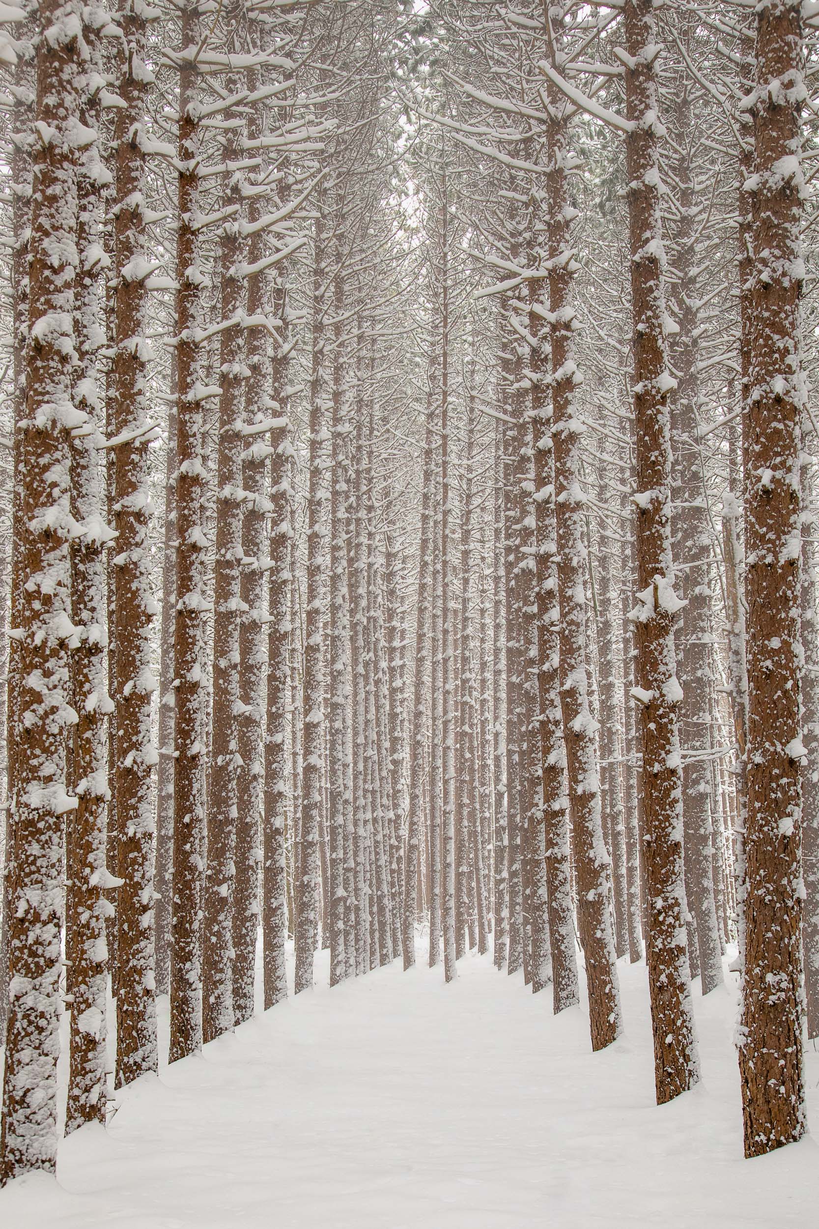 The first snow of the season freshly coats a pristine row of planted pine trees in Southern Maine.