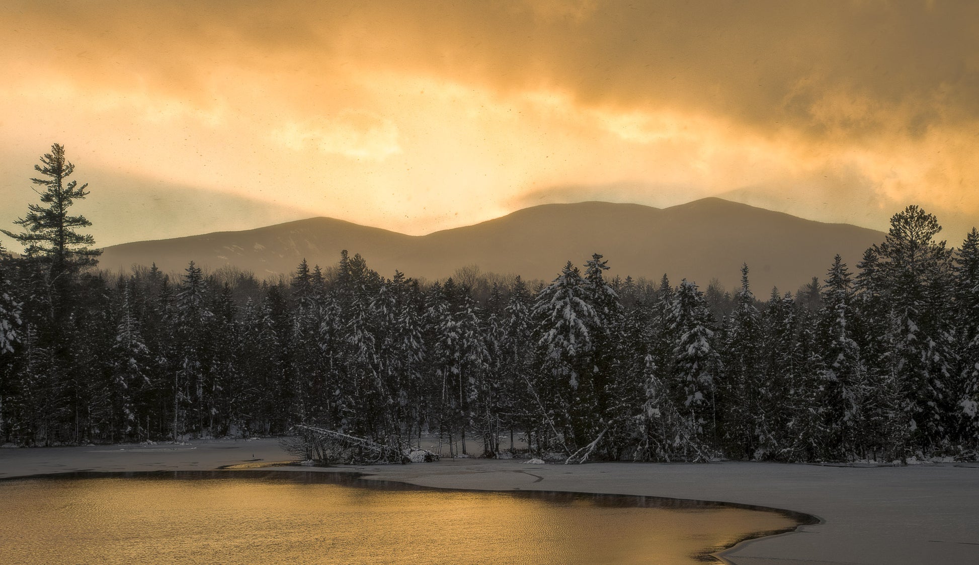 A clearing snow squall allows sunlight to erupt from behind the Crocker Range, Carrabassett Valley, Maine.